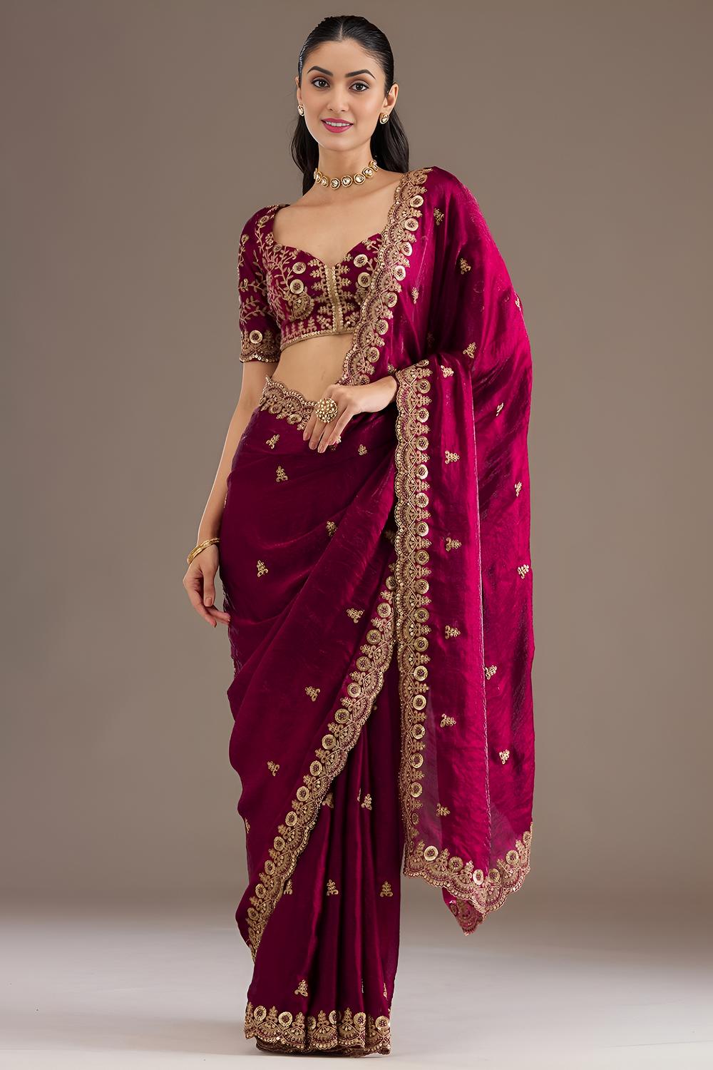 Elegant Maroon Embroidered Tissue Designer Border Ready to Wear Saree by One Minute Saree – Luxurious Fabric for Every Occasion