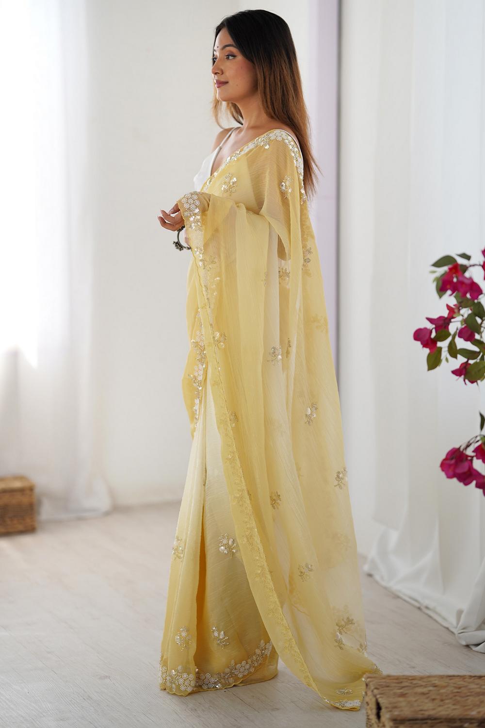 Elegant Yellow Chiffon Sequin Embellished Border Ready to Wear Saree by One Minute Saree – Luxurious Fabric for Every Occasion