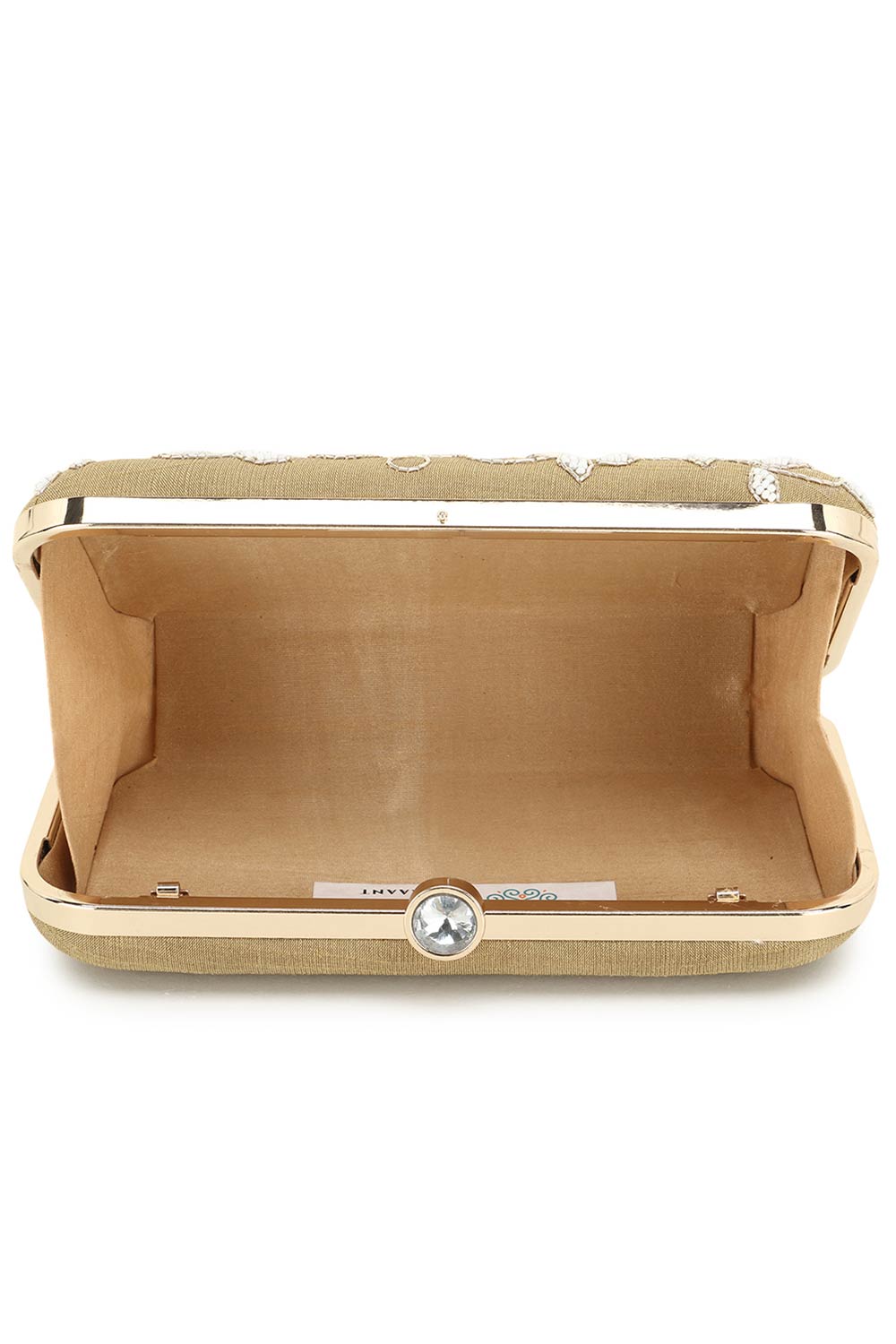 This Beige & White Box Clutch from features a Botanical Embellished pattern on a Faux Silk fabric. It has a Click closure and a detachable chain strap. Features a matching Embellished work for a distinct look.
