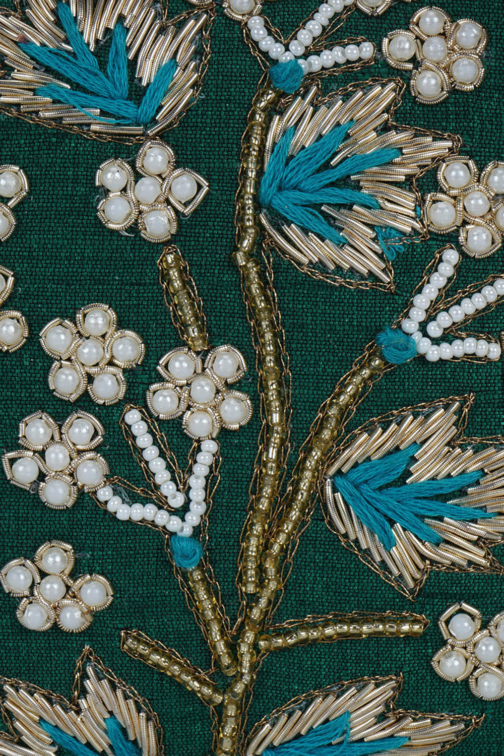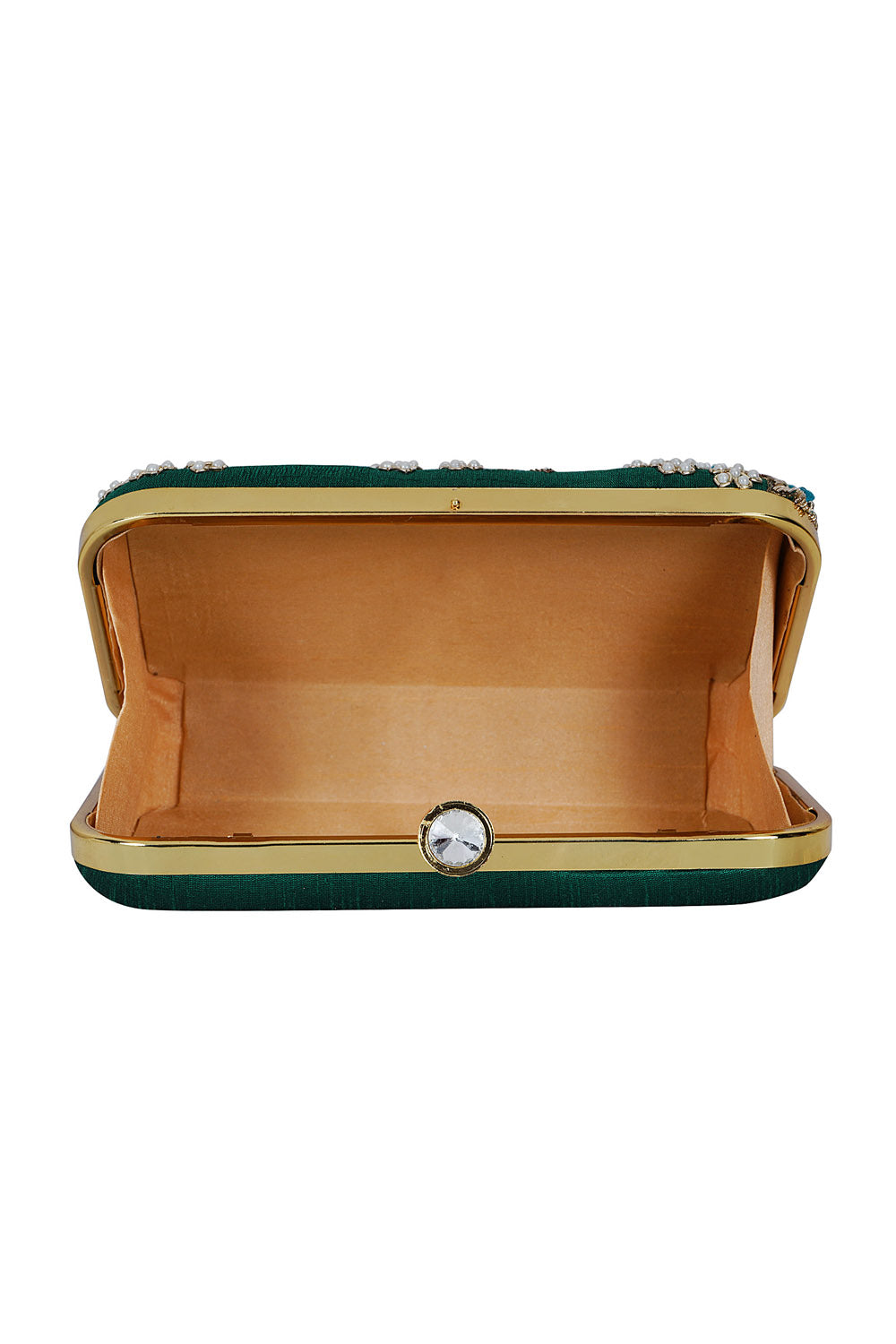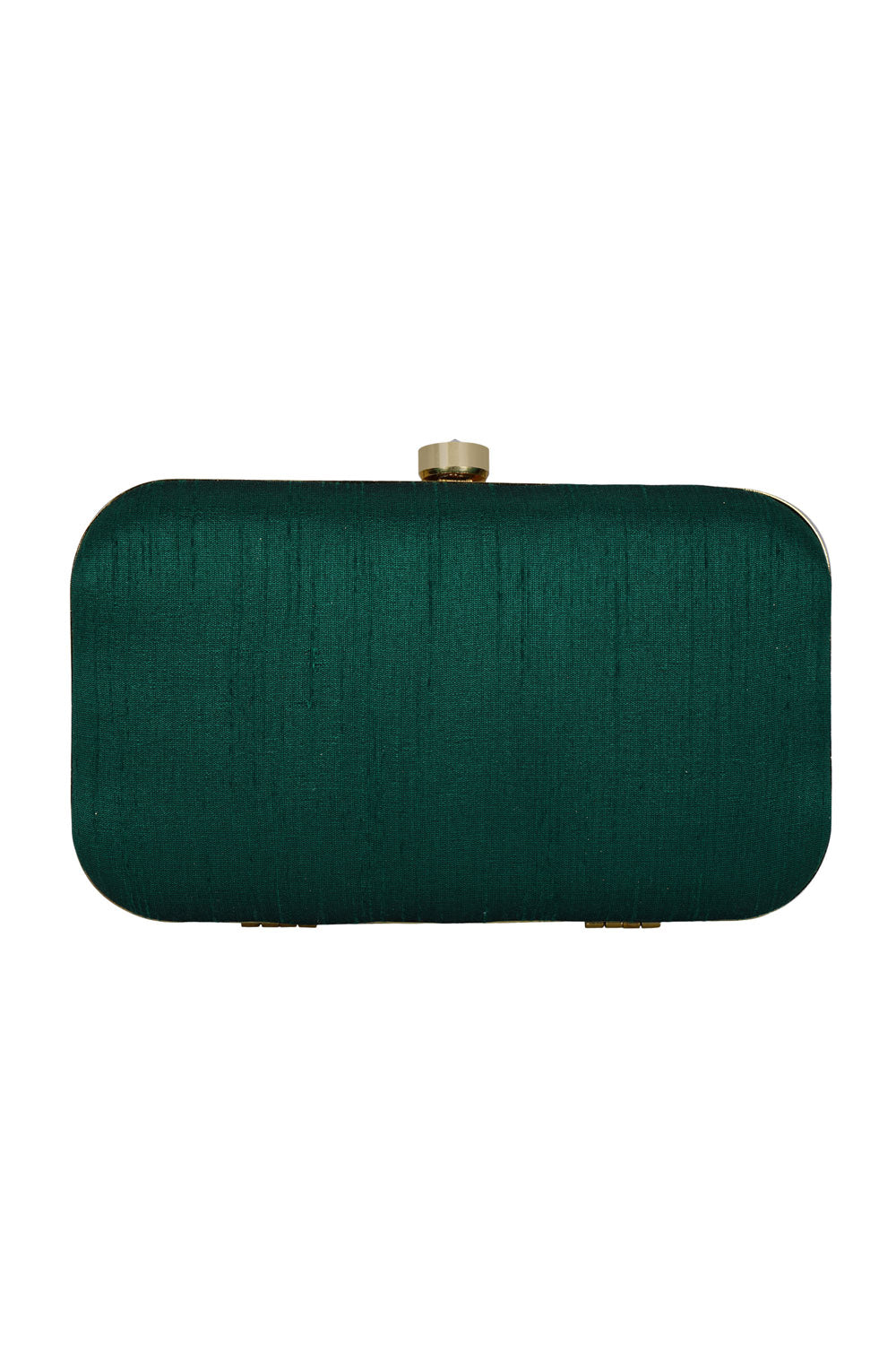 This forest green and multi-colored hand-crafted faux silk embroidered box clutch with embellished work is best fit for party or ethnic collection. It has one main compartment with clasp closure and a detachable metal chain. Can also be used as a sling bag.