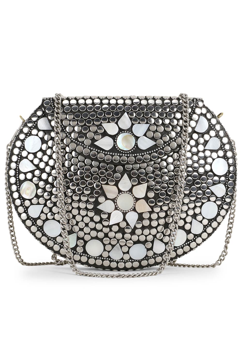 A must have Botanical Mosaic Clutch. This Silver & White Metal Clutch comes with a sturdy Detachable Shoulder Strap. It has 1 main compartment secured with a Click closure.