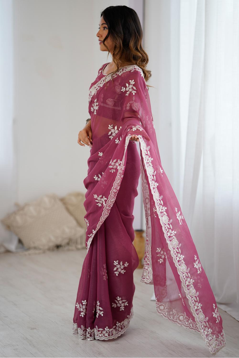 Elegant Mauve Georgette Floral Embroidered Ready to Wear Saree by One Minute Saree – Luxurious Fabric for Every Occasion