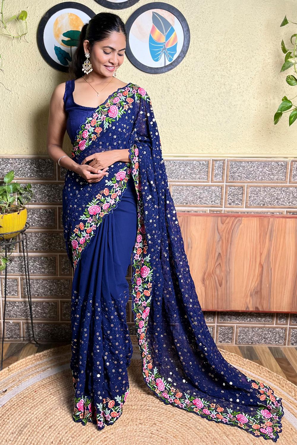 Rishi Navy Blue Georgette Floral Embellished Ready to Wear Saree