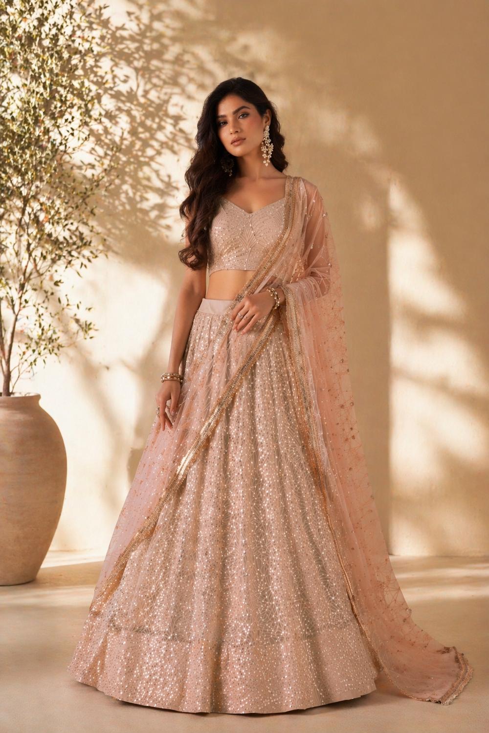 Priyanka Peach Net Thread & Sequins Embroidered Lehenga Saree