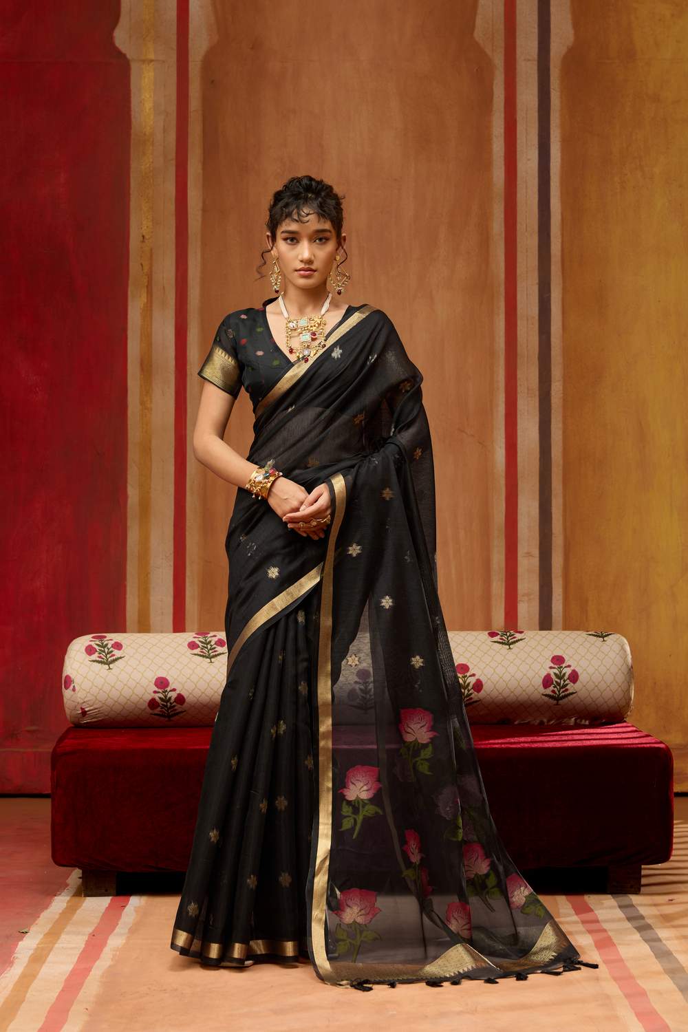 Rosa Black Munga Cotton Saree with Organza Weaving Pallu Ready to Wear Saree