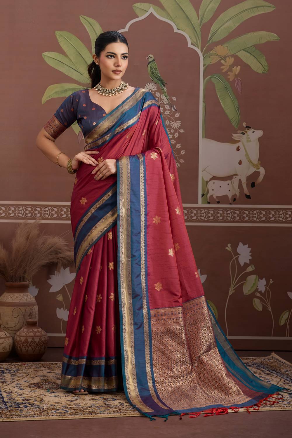 Elegant Maroon Tussar Silk Saree by One Minute Saree – Luxurious Fabric for Every Occasion