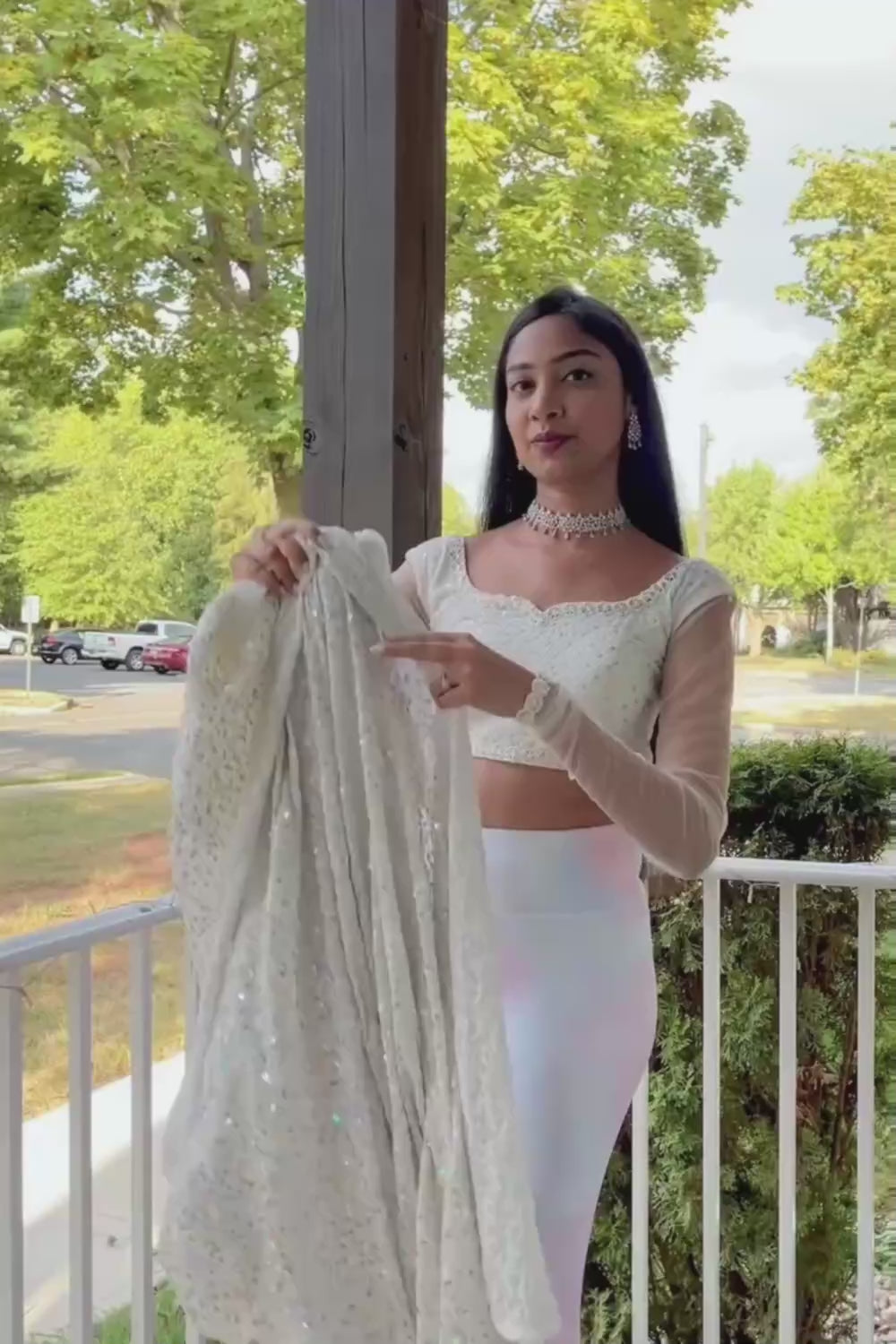 Radiate charm and grace with every step with our Salma Pearl White Sequins Embroidery Georgette One Minute Saree, a masterpiece that defines timeless sophistication. Crafted from ethereal Georgette, it's drenched in heavy sequins that shimmer like stars against a pristine white canvas. With a matching thin strap, sleeveless Deep U blouse, this saree whispers modern luxury while preserving classic grace.