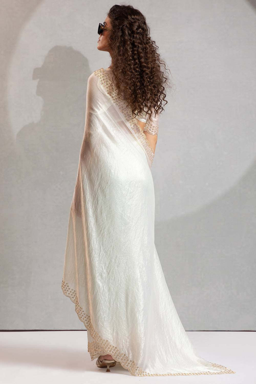 Elegant Off White Satin Silk Saree with Embellished Border by One Minute Saree – Luxurious Fabric for Every Occasion