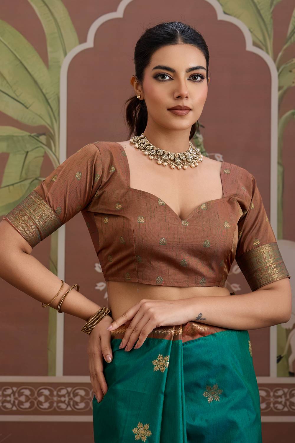 This stunning Bottle Green Tussar Silk Handloom Woven Saree with Motif Work from One Minute Saree is crafted from premium fabric, offering a luxurious feel and a graceful drape. The rich texture and subtle sheen make it a perfect choice for festive occasions and elegant gatherings. Designed for ease and comfort, this pre-stitched saree features a built-in petticoat and a flexible fit, ensuring effortless wear and a flattering silhouette. Blending timeless elegance with modern convenience, this saree is a must-have addition to your ethnic wardrobe.